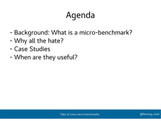 The document discusses Linux micro-benchmarks, which measure small portions of a system's performance rather than modeling a real workload. While micro-benchmarks can be misused, they are valid when used correctly to understand bottlenecks by profiling workloads. Several case studies are presented, showing how micro-benchmarks can reveal unexpected behaviors when systems calls are measured, such as a benchmark that actually measured page faults in addition to forks. Micro-benchmarks are most useful when profiling to identify bottlenecks, when they are kept very simple, and when they have been thoroughly tested.