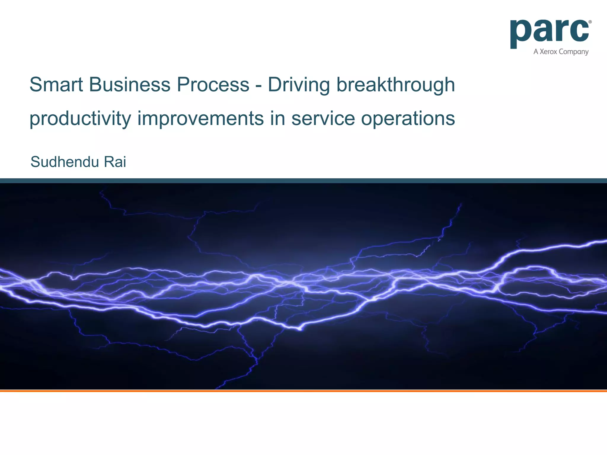 The document discusses smart business processes and process optimization. It introduces the concept of a smart business process as one that is continually optimized using data-driven simulation, optimization, and real-time analytics. It provides an overview of Xerox services capabilities and the need to improve processes using data-driven approaches. Examples of process optimization research areas are discussed like simulation optimization, process flexibility, and buffer optimization. The strategic vision is to advance the science of data-driven process simulation optimization and demonstrate significant business impacts.
