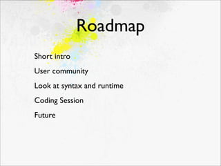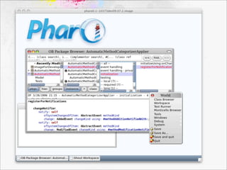 Pharo is a clean, open-source Smalltalk environment for professional use. It is a dynamically typed, pure object-oriented language with an integrated development environment. Pharo has a large community of developers and is used in both industry and academia. Future plans include improving performance, tools, and infrastructure to allow the language to continuously evolve.