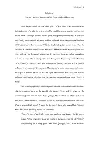 The document compares and contrasts the tabloid talk show "The Jerry Springer Show" and the late-night entertainment talk show "Late Night with David Letterman". Some key differences include: Springer's show featured outrageous guests and content like violence and profanity, while Letterman focused more on conversations with celebrity guests. Springer's audience was seen as "low rent" while Letterman appealed to a broader, more educated audience. The environment on Springer's show emphasized spectacle, while Letterman's gave a more classy feel.