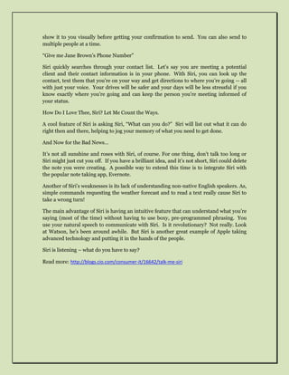 This document discusses the voice assistant Siri and some of its capabilities. Siri can be used to schedule meetings, send emails and texts, look up contact information, and provide information about what tasks it can perform. While Siri is generally effective, it has weaknesses like cutting off long instructions and having difficulty understanding non-native English speakers. The document concludes that Siri is another example of Apple making advanced technology easily accessible to consumers.