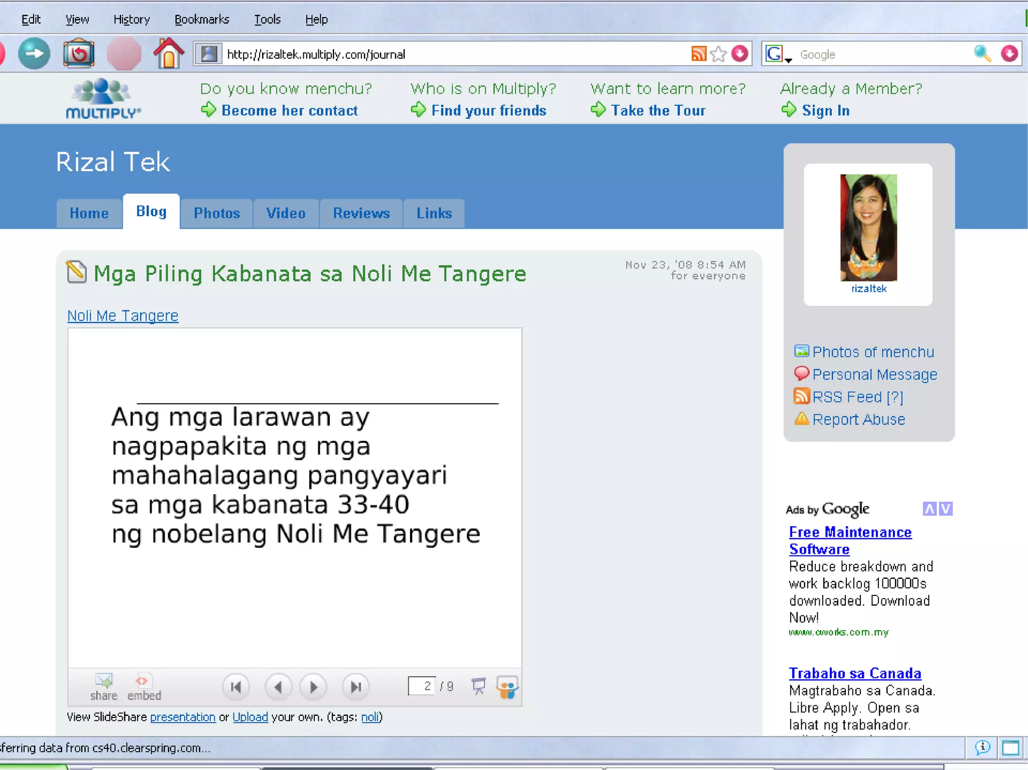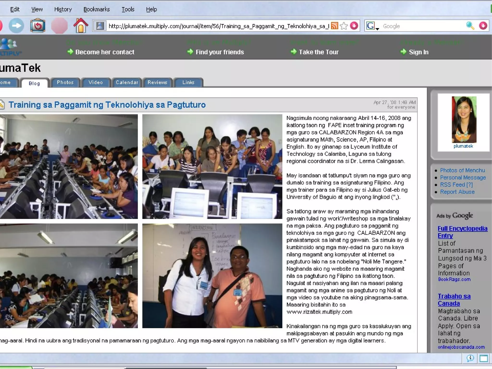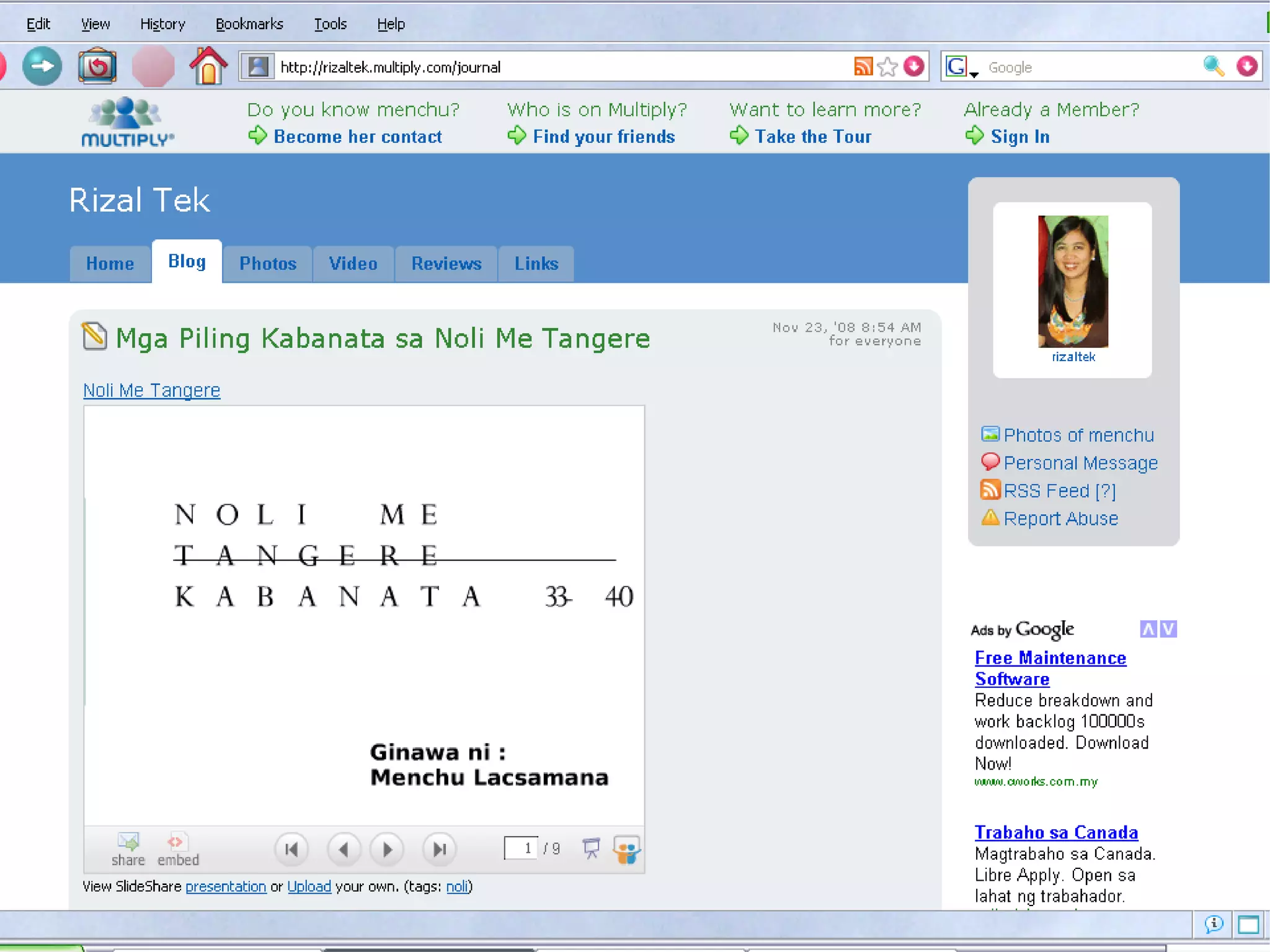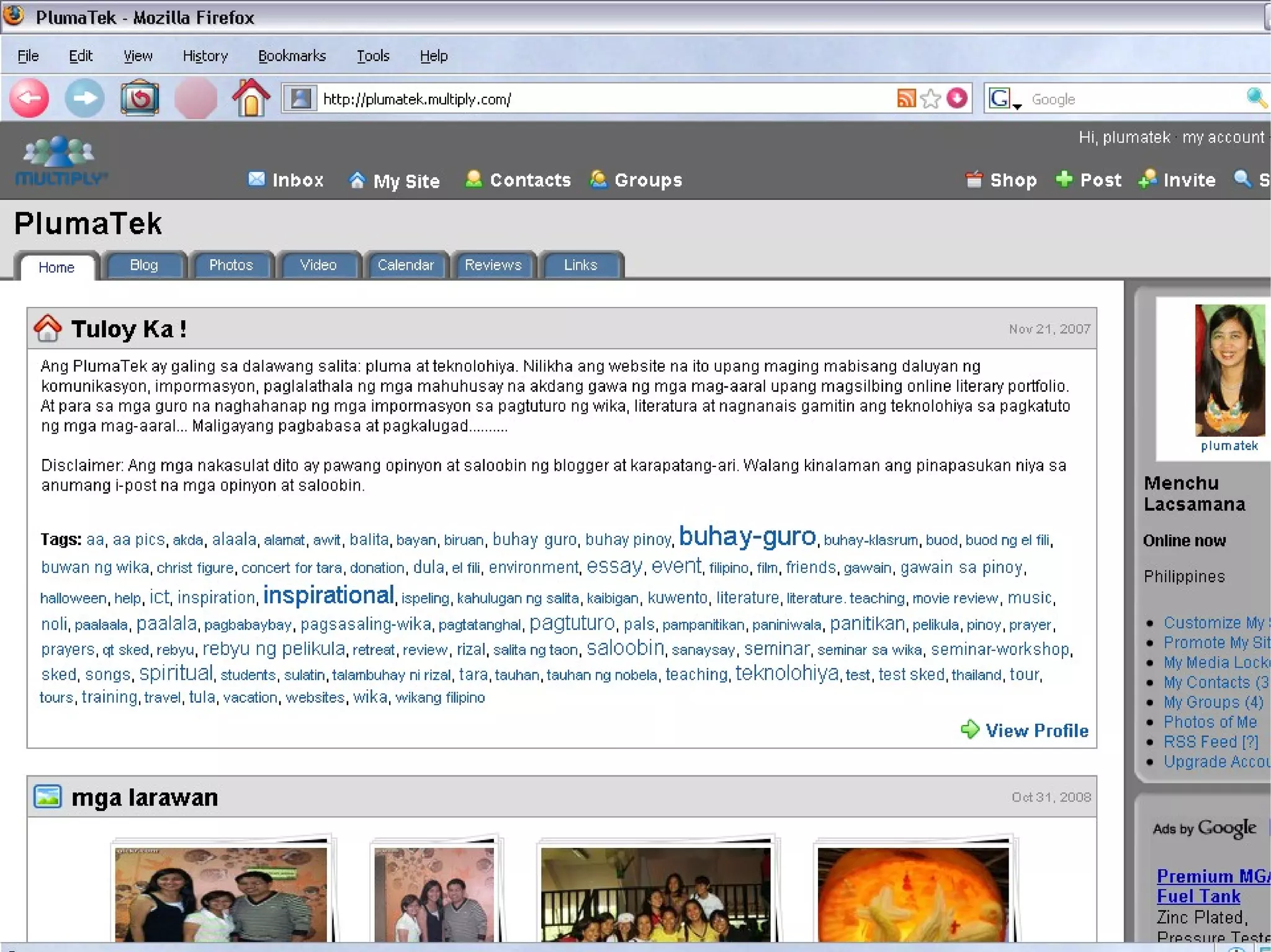 This presentation discusses using the social network Multiply for teaching Filipino literature, highlighting the benefits of increased accessibility, collaboration, and improved writing skills. It includes personal experiences with blogging, setting up a blog, and emphasizes the importance of technology in education. The conclusion stresses active engagement, creativity, and professional networking as essential components of teaching and learning.