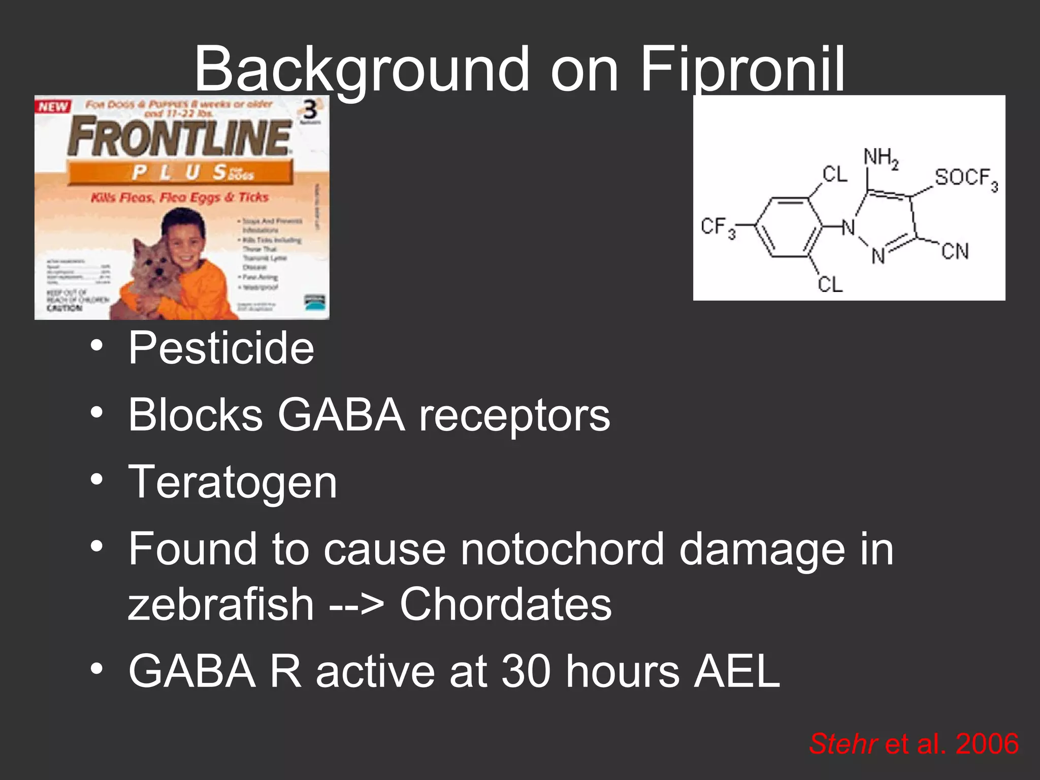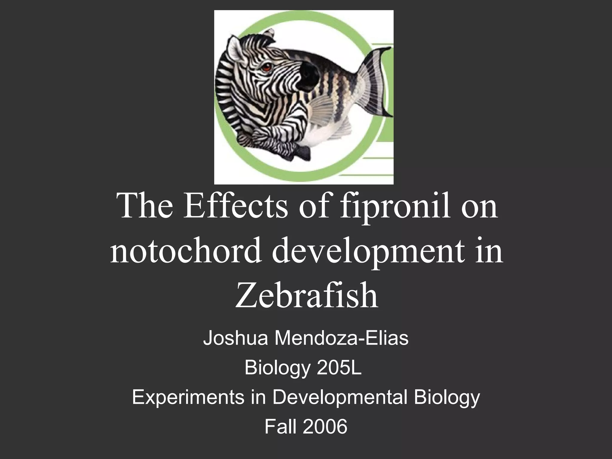 This document analyzes the effects of the pesticide fipronil on notochord development in zebrafish, highlighting its role as a neurotoxin that damages the notochord. The study concludes that higher concentrations of fipronil lead to greater damage and necrosis, with behavioral responses indicating neurodegeneration. Future research is suggested to include antibody staining to further investigate the notochord's condition.