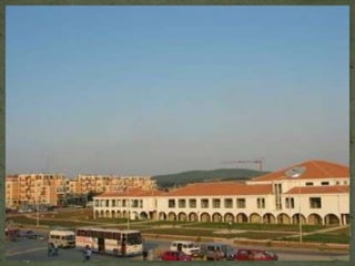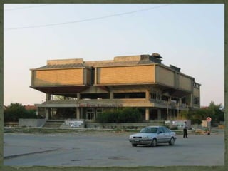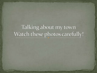 This document contains a series of questions about a town, its places, buildings, sports clubs, cultural events, and changes over time. It asks what is shown in photos of the town, what the differences are between photos, and which buildings or situations are no longer accurate. It also asks about favorite places, sports, and what could be changed or added to better represent the town.