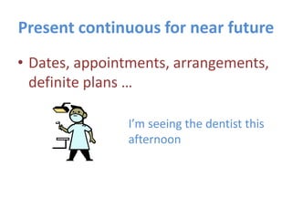 The document discusses the use of different verb tenses and structures to talk about the future in English. It explains that the present continuous is used for near future plans that have already been arranged, like "I'm seeing the dentist this afternoon." The structure "be going to" is used for intentions, resolutions, fixed plans, and predictions based on present evidence. Common examples given are New Year's resolutions and predicting "The red car is going to run over the man." The document also discusses using "will" for uncertain predictions and promises, offers, and requests regarding the future.