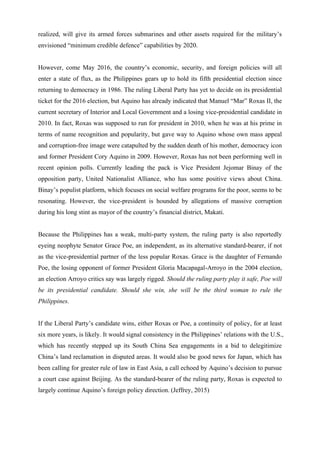 The document discusses key issues facing the next President of the Philippines in foreign policy and regional affairs. These include: (1) ongoing territorial disputes in the South China Sea, with the PCA expected to rule against China in 2016; (2) balancing national interests and regional cooperation as ASEAN chair in 2017, including tensions between ASEAN states and China; and (3) ensuring continued economic integration among diverse ASEAN members under the ASEAN Economic Community. The next President will play a pivotal role in shaping the Philippines' approach to these important challenges.