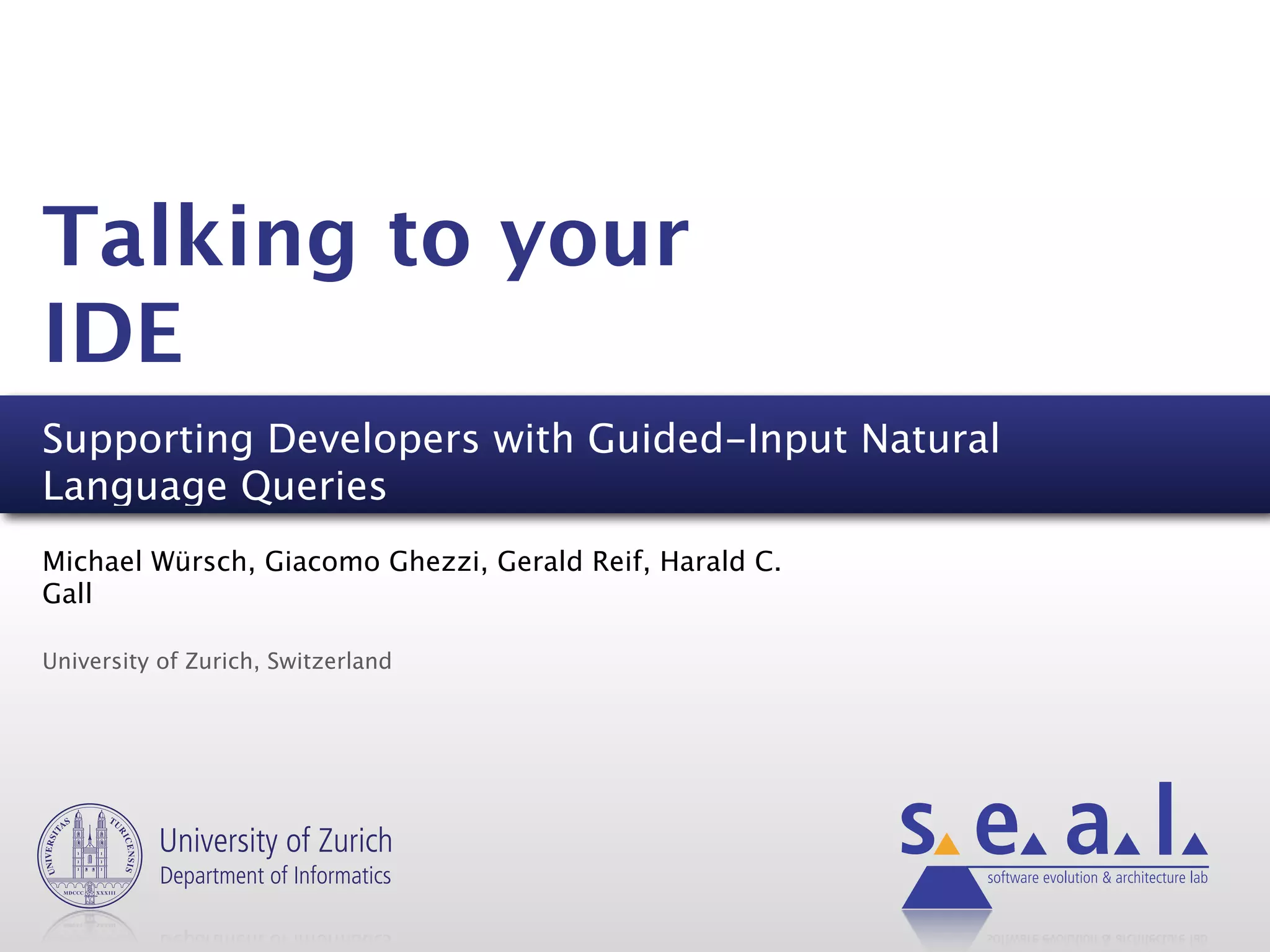 The document discusses the integration of guided-input natural language queries into IDEs to assist developers in software maintenance and architecture. It highlights various queries that developers may want to perform, emphasizing the importance of natural language for expressiveness and ease of use, and describes the architecture and ontology layers supporting such a system. Validation efforts are mentioned, indicating a proof-of-concept implementation with user studies aimed at improving functionality and usability.