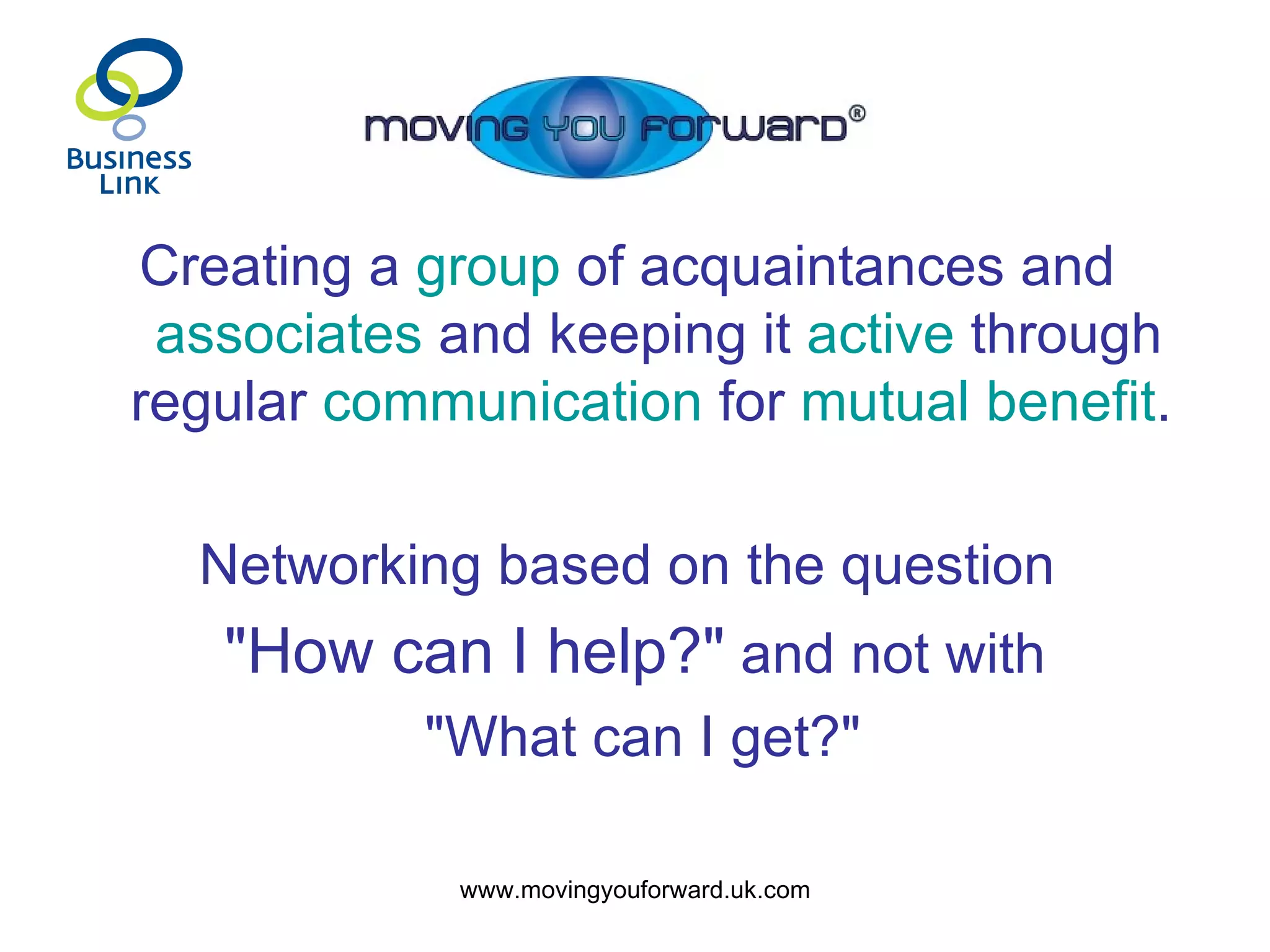 The document provides tips and guidance for networking to benefit one's business. It discusses creating a group of acquaintances and associates through regular communication. Networking should be done with the mindset of "How can I help?" rather than "What can I get?". The document also discusses adapting one's behavior to meet the needs of others, developing an effective elevator pitch, and tips for successful networking such as consistency, commitment, being targeted, and following through on promises.