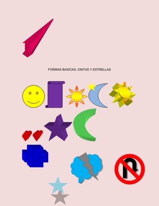 This document discusses basic shapes with shadows, arrows with 3D dimensions, and basic shapes, ribbons, and stars. It focuses on creating taller autoformas or self-forming shapes through different techniques.