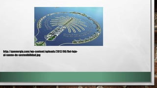 The document contains several images showing the Palm Islands development projects in Dubai, United Arab Emirates. The images depict the artificial Palm Jumeirah island, which is one of the three Palm Islands, as well as the luxurious homes and resorts built on the man-made islands extending into the Persian Gulf.