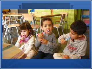 The story is about Margalida's mother teaching her how to take care of her teeth. It seems to be an interesting tale about dental hygiene told in a fun way for children to learn. The short text suggests there is a story within about proper brushing and cleaning techniques.