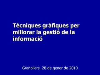 Text, taules igràfics No sempre un gràfic és l’element més il·lustratiu. Frases escrites, taules i gràfics tenen el seu propi lloc en el discurs de la construcció de la claredat i el coneixement. Quan cal utilitzar un gràfic (Edward Tufte): Una frase no és útil per mostrar més de 3 dades Una taula és un recurs idoni per mostrar entre 3 i 20 dades A partir d’aquí ja és aconsellable un gràfic, que serà més útil com més dades representi