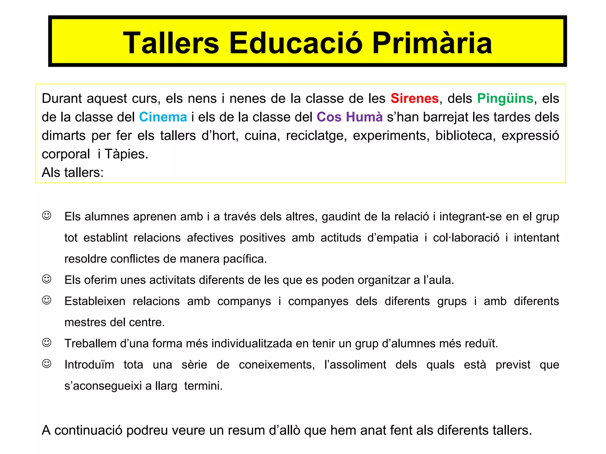 A continuació podreu veure un resum d’allò que hem anat fent als diferents tallers.