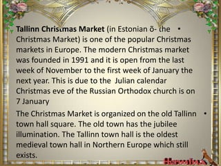 The Old Tallinn Christmas Market, established in 1991, is a popular European Christmas market located at the historic Town Hall Square, open from the last week of November to early January. It coincides with the Julian calendar's Christmas Eve, observed by the Russian Orthodox Church on January 7. The market features the jubilee illumination and highlights Tallinn's medieval architecture.