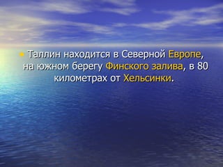 Таллин, столица Эстонии, расположен на южном берегу Финского залива, в 80 км от Хельсинки. Главным источником питьевой воды является озеро Юлемисте, в то время как река Пирита — единственная значительная река города, находящаяся вдали от центра. В городской территории также выделяется балтийско-ладожский уступ, заметный на некоторых участках города.