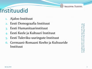 Ajaloo InstituutEesti DemograafiaInstituutEesti HumanitaarinstituutEesti Keele ja Kultuuri InstituutEesti Tuleviku-uuringute InstituutGermaani-Romaani Keelte ja Kultuuride Instituut29.04.20102Tallinna Ülikool, Narva mnt 25, 10210 TallinnTel. 640 9101, faks 640 9116, e-post tlu@tlu.eeInstituudid
