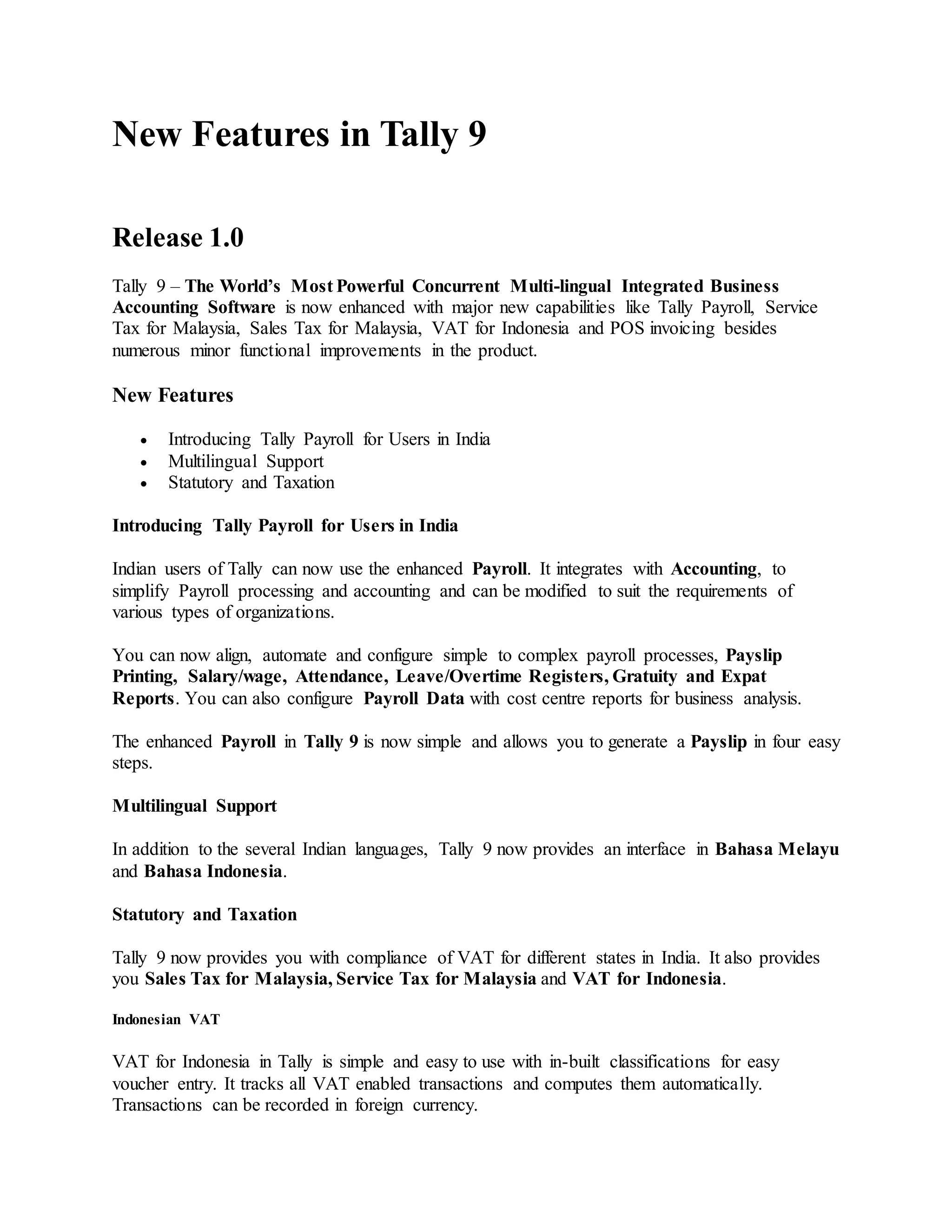 Tally 9 introduces several new features including Tally Payroll for India, multilingual support in Bahasa Melayu and Bahasa Indonesia, and statutory compliance for VAT in Indonesia, sales tax and service tax in Malaysia. It also includes numerous minor enhancements such as the ability to enter purchase invoices simultaneously in a multi-user environment, negative quantity warnings, exclusion of groups for payment/receipt vouchers, and staggered delivery tracking. Upgrades from Tally 8.1 require selecting the country and may involve recreating budgets.