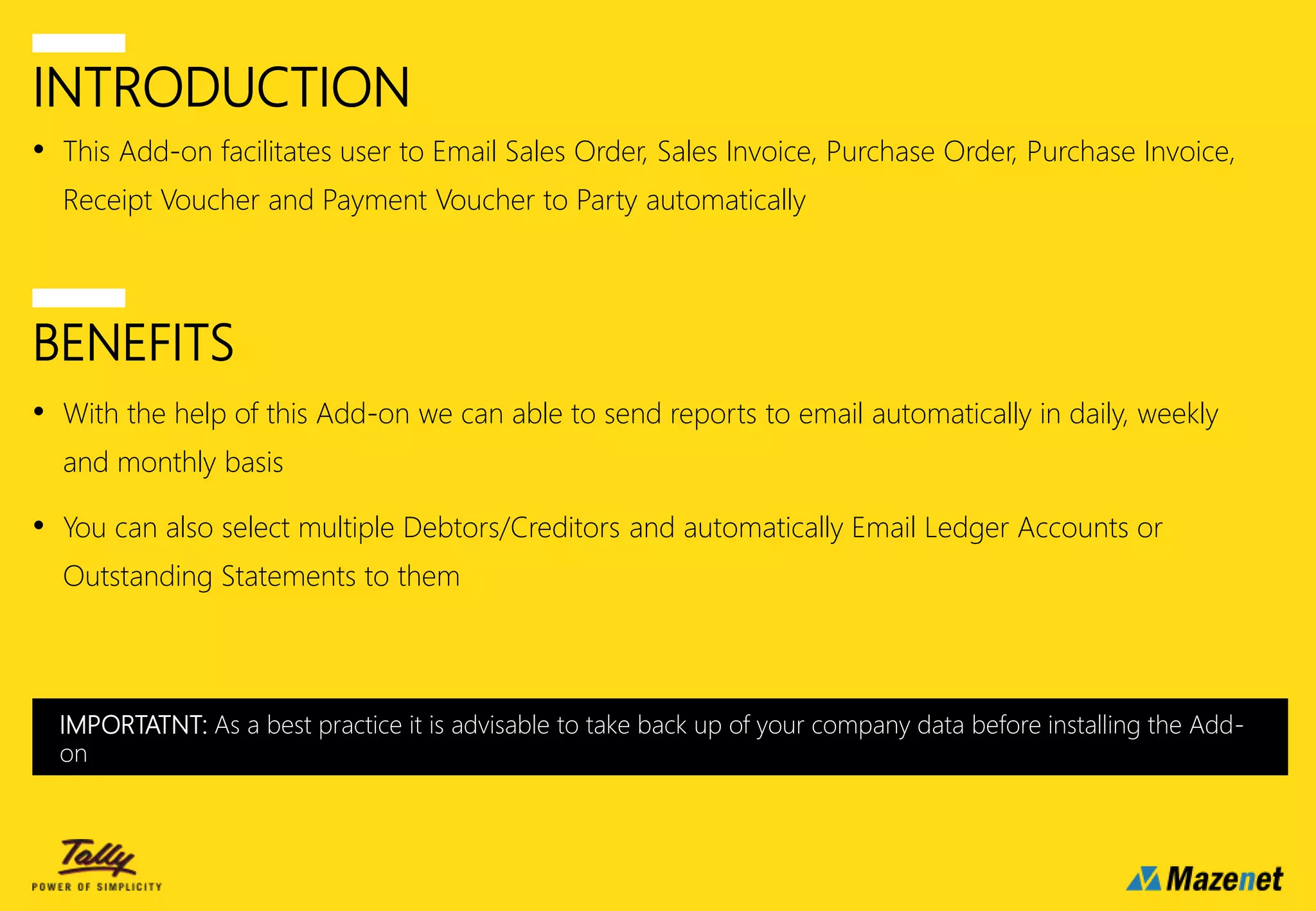 The document outlines an add-on for Tally that allows automatic emailing of various financial documents such as sales orders and invoices. Users can configure the add-on to send reports at set intervals (daily, weekly, or monthly) and to multiple recipients. A series of setup steps is provided to enable this functionality, along with a reminder to back up company data before installation.