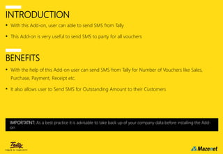 The Tally Auto SMS add-on allows users to send SMS notifications for various voucher types such as sales, purchases, payments, and receipts directly from Tally. Users are advised to back up their data before installation and follow a setup guide to configure the add-on and enable the SMS feature. Once set up, users can choose to send SMS notifications upon completing voucher entries.