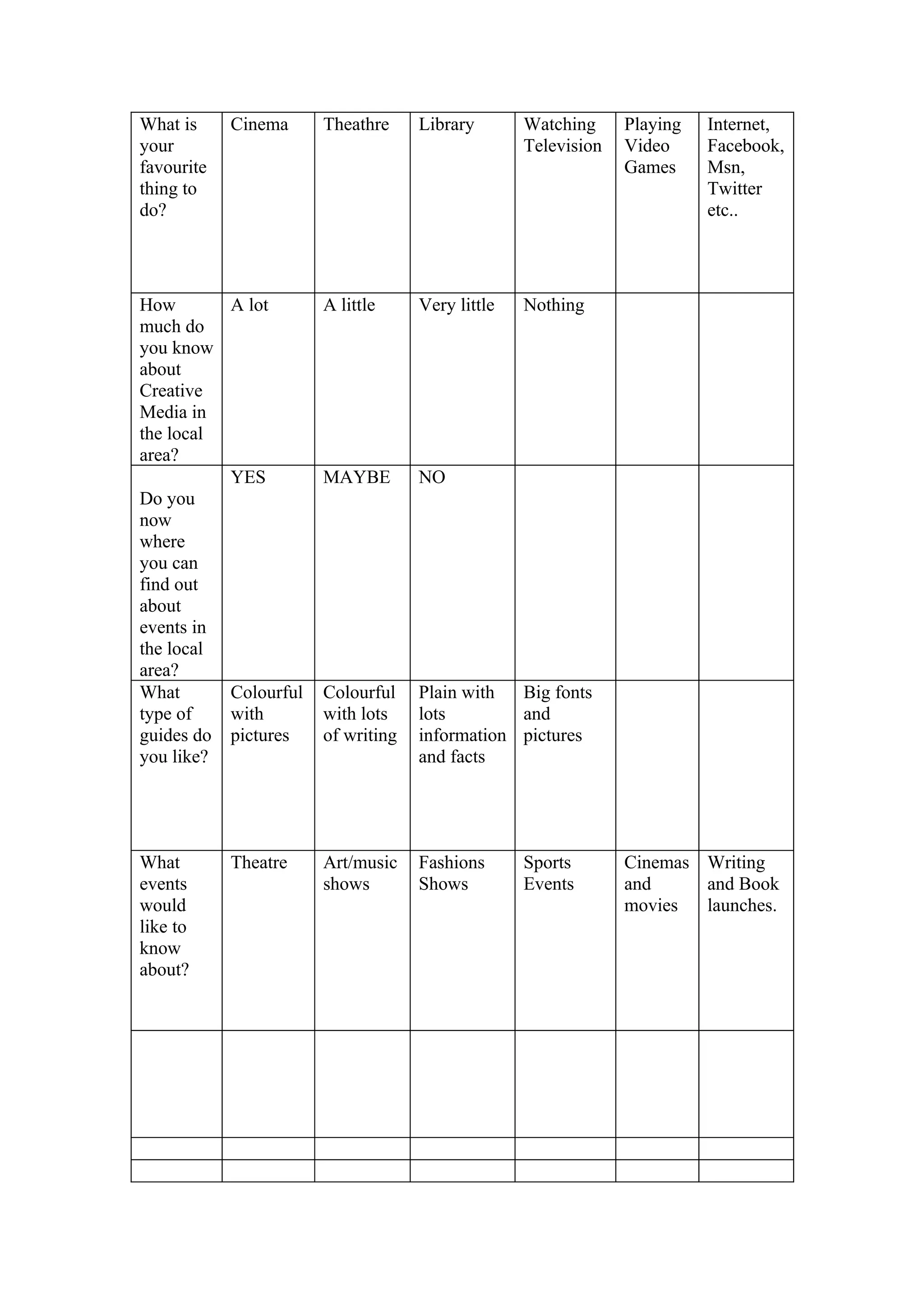 The document is a survey asking about favorite activities, knowledge of creative media in the local area, preferences for event guides, and what types of cultural events the respondent would like to know about. Respondents are given multiple choice options to select for each question, covering common leisure activities, levels of knowledge, ways to find local information, design styles for guides, and genres of events.
