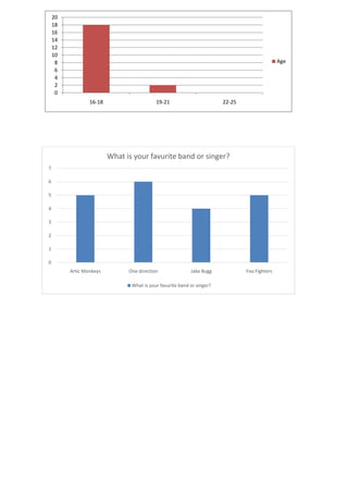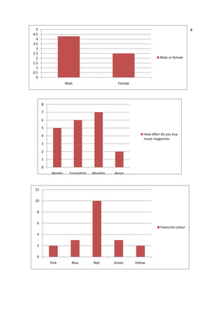 The document contains the results of a survey about music magazine readership. It includes charts on the respondents' gender, how often they buy music magazines, favorite colors, age, favorite bands/singers, words associated with indie music, favorite aspects of music magazines, favorite music magazines, favorite regular magazine features, preferred free gifts, and how much would be spent on a music magazine.