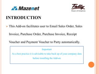 The document describes an add-on for Tally that enables automatic emailing of various financial documents such as sales orders and invoices. It outlines the importance of backing up company data prior to installation and provides a setup guide for configuring the add-on features. Users can schedule emails on a daily, weekly, or monthly basis and select multiple recipients for ledger accounts or outstanding statements.