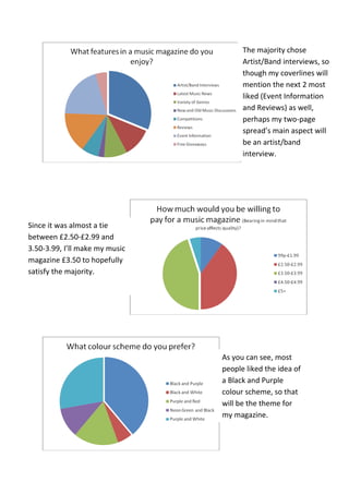 The document summarizes the results of a questionnaire about music magazine preferences. Based on the results, the magazine will focus on alternative music and mention some foreign language music. It will be published monthly to reduce costs. The main feature will be artist/band interviews. The magazine will be priced at £3.50 and have a black and purple color scheme targeting 16-18 year olds. The masthead font will be Inked God.