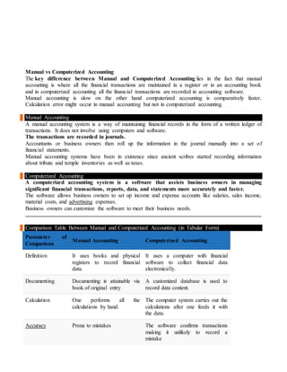 The document compares manual and computerized accounting, highlighting that manual accounting involves handwritten records while computerized accounting uses software for faster and more accurate financial management. It discusses the advantages and disadvantages of both systems, including features of Tally software, which automates many accounting processes and enhances data reliability. Additionally, the document provides instructions on how to create, modify, and delete accounts and groups within Tally ERP 9.