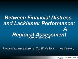 The document analyzes capital flows and economic performance in Latin America and other emerging markets between 1997-2002. It finds that Latin America experienced a "triple whammy" after a reduction in capital inflows, with higher credit costs, currency depreciation, lower investment and slower growth. Charts show trends in various countries' capital flows, current accounts, GDP and more over this period.