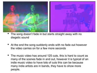 The music video for Tame Impala's "Elephant" features around 125 cuts between scenes of the band playing and singing. A bright rainbow filter and kaleidoscope effect are used throughout the video to transition between scenes. There is no overarching narrative; rather, the video simply focuses on showing the band perform without any costume changes, consistent with the typical style of an indie band music video.