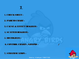 The document lists various quality management tools created by K. Sathyam, including checksheets, Pareto charts, cause and effect diagrams, scatter diagrams, histograms, control charts, and stratification. Each tool is accompanied by details regarding its construction and purpose. The content emphasizes the application of these tools in analyzing and improving processes.