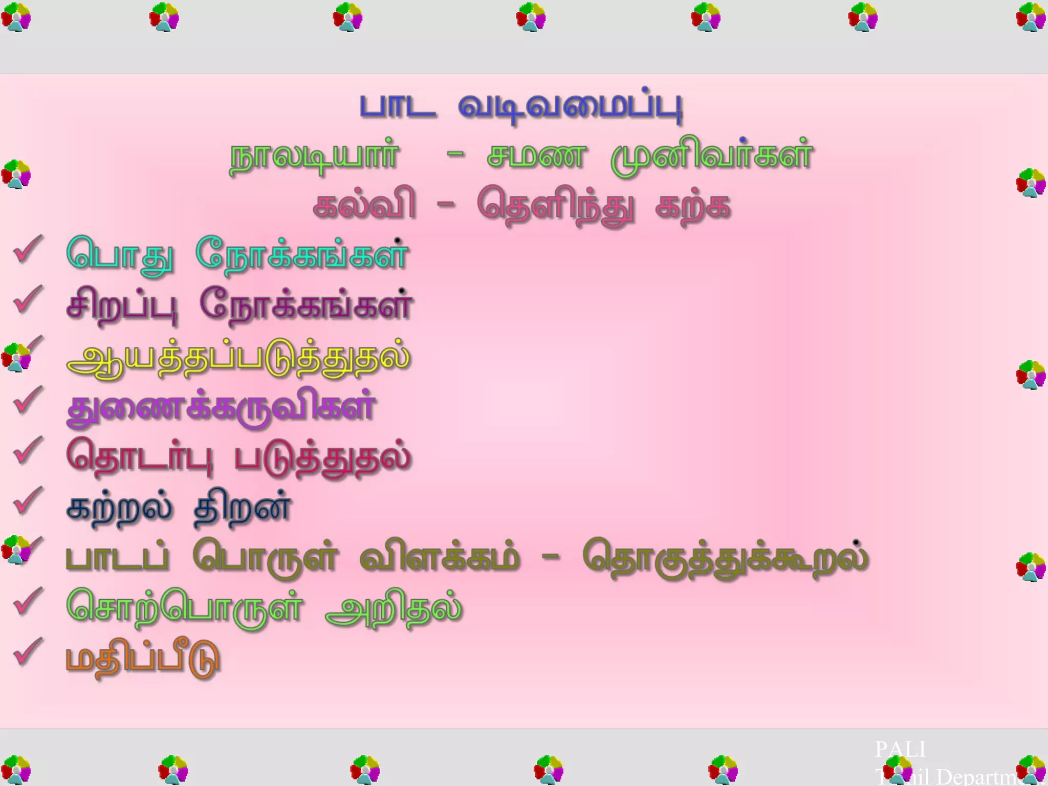3. The document quotes a saying that learning the language is most effective when taught by teachers who have a deep love and understanding of Tamil.