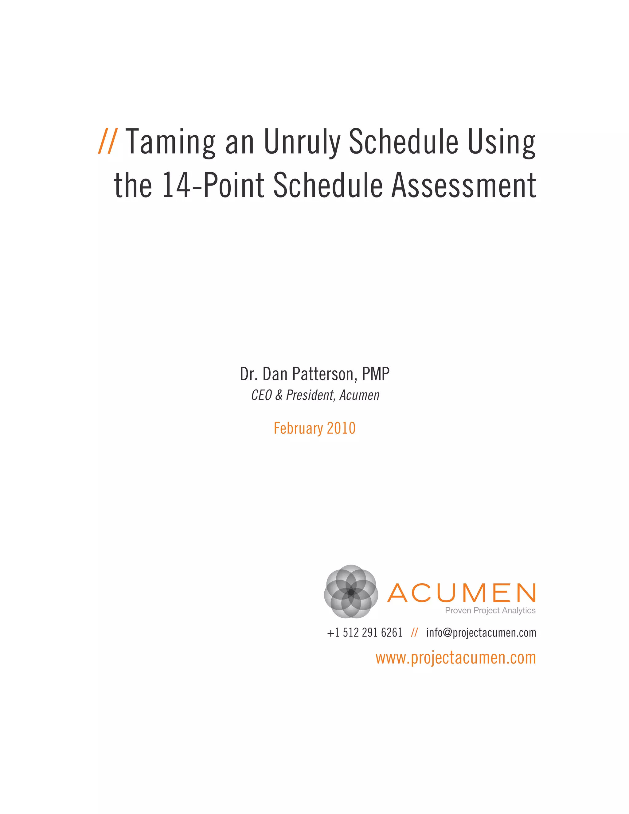 The document outlines the 14-point schedule assessment developed by the Defense Contract Management Agency, which provides a structured method for evaluating project schedules through various checks focusing on logic, constraints, and performance metrics. While the assessment does not cover every aspect of scheduling, it serves as a valuable framework for improving project outcomes by identifying risks and opportunities in project planning and execution. Additionally, the document emphasizes the importance of further metrics and techniques, like schedule path analysis, to enhance the quality and timeliness of project schedules.