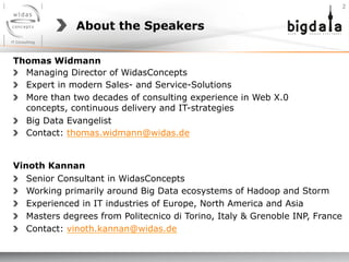 The document discusses how modern software architectures can help tame big data. It introduces the speakers and provides an overview of WidasConcepts. The agenda includes a discussion of how big data can help businesses, an example of big data applied in the CarbookPlus platform, and new software architectures for big data. Real-time systems and architectures like lambda architecture are presented as ways to process big data at high velocity and volume. The conclusion emphasizes that big data improves business efficiency but requires tailored implementations and new skills.