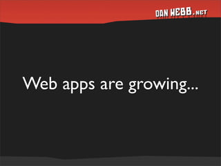 The document discusses the challenges of managing complexity in Ajax applications. It notes that web apps are growing but browser incompatibilities, testing and debugging difficulties, and JavaScript performance issues make development challenging. Design patterns can help address recurring problems, document proven solutions, and manage complexity. Different trade-offs exist between server-side and client-side development with regards to qualities like maintainability, reusability, and performance. The document recommends applying the Behavior pattern to semantically mark up templates without extra scaffolding for JavaScript.