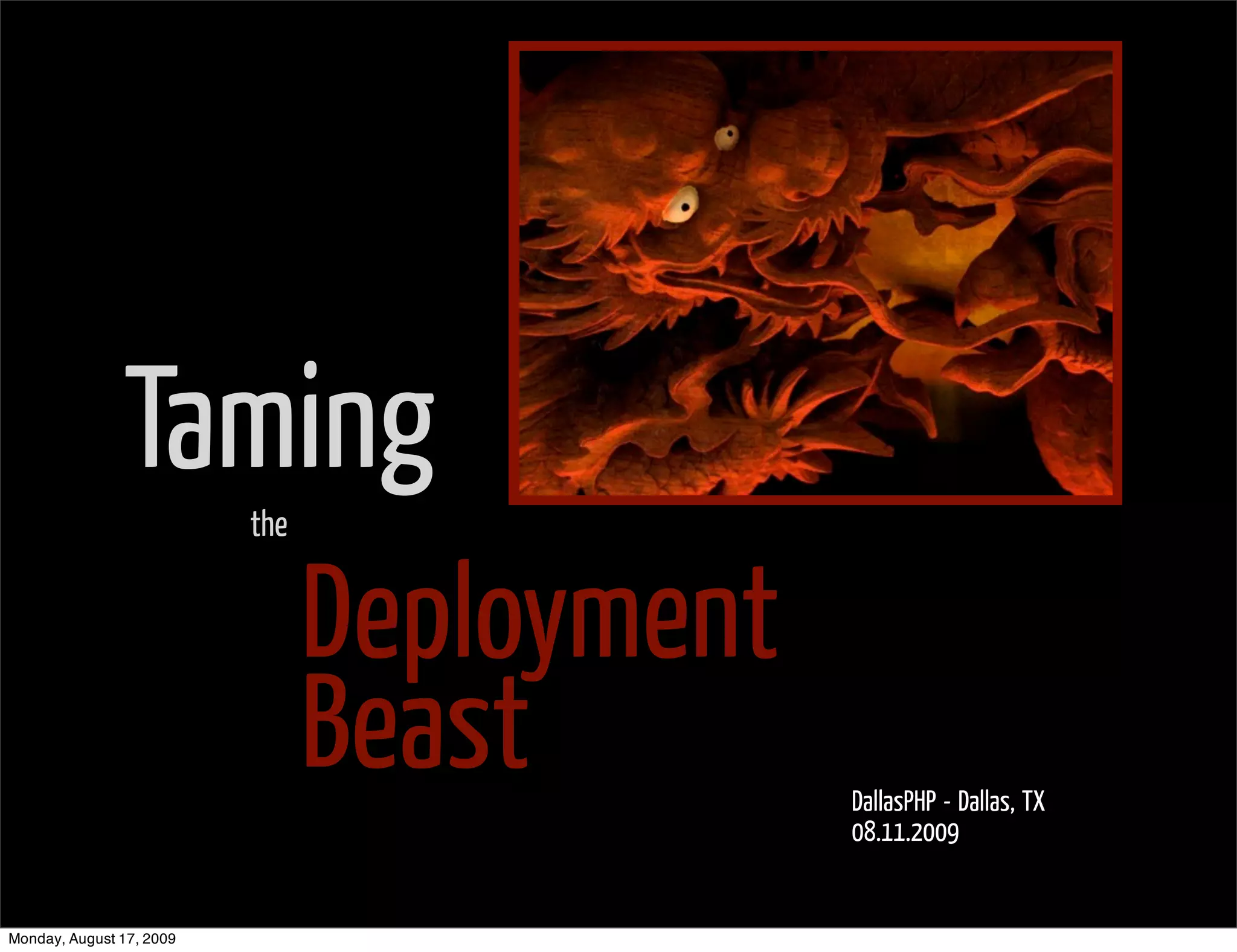 The document discusses various aspects of software deployment including testing, version control, documentation, and automation tools. It covers setting up separate environments for development, testing, staging, and production. It also describes tools for version control (CVS, Subversion, Git), building (Phing, Ant, Capistrano), testing (Selenium, WebTests), documentation (phpDocumentor, wikis), and enforcing coding standards (Tidy, PHP_CodeSniffer). Continuous integration is discussed along with options for deployment.