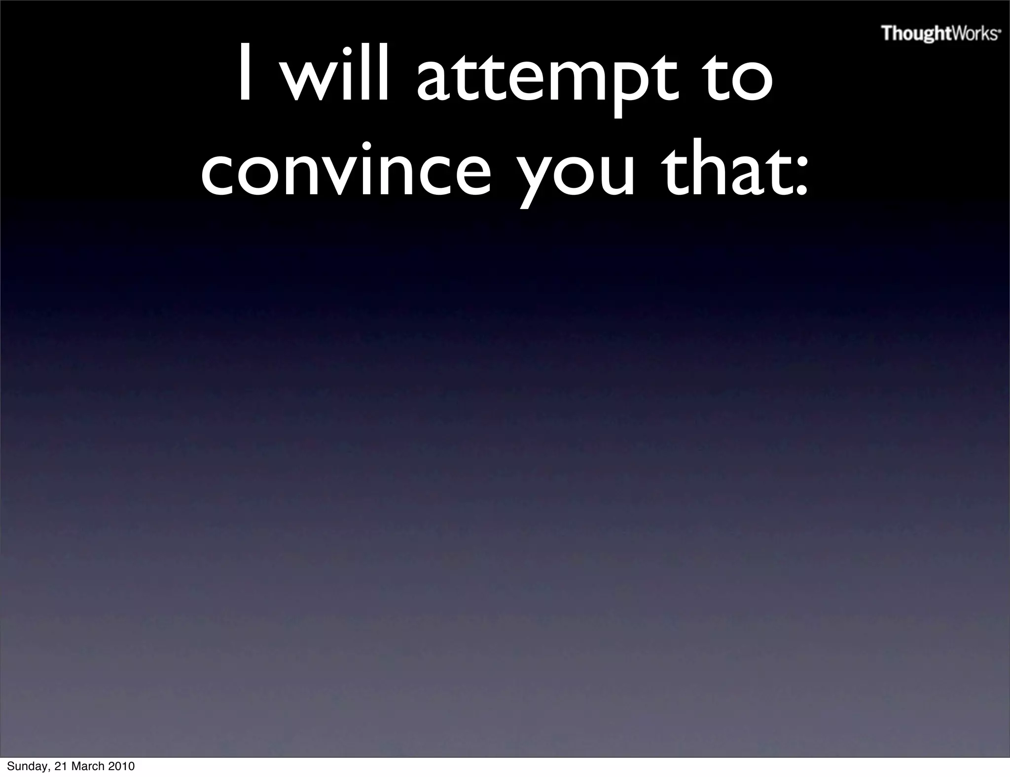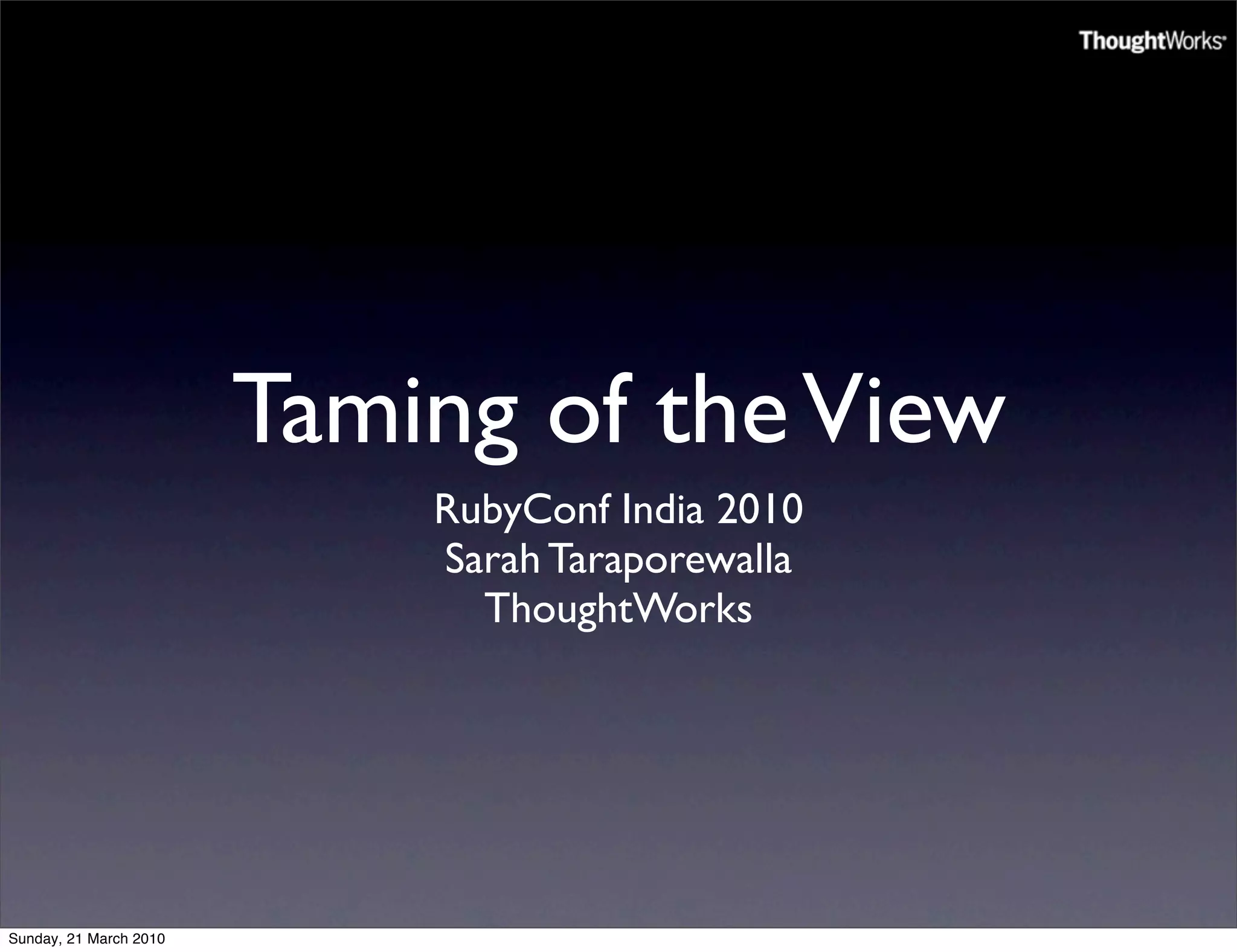 The document summarizes a presentation on improving template engines. It argues that current template engines are too permissive, leading code bases to break fundamental principles. It demonstrates problems with examples using traditional template engines and shows improvements using StringTemplate and Slippers template engines, which enforce stricter separation of view and model logic for more testable, maintainable code. The presentation aims to convince the audience to consider alternative template engines that make it easier to develop code the right way.