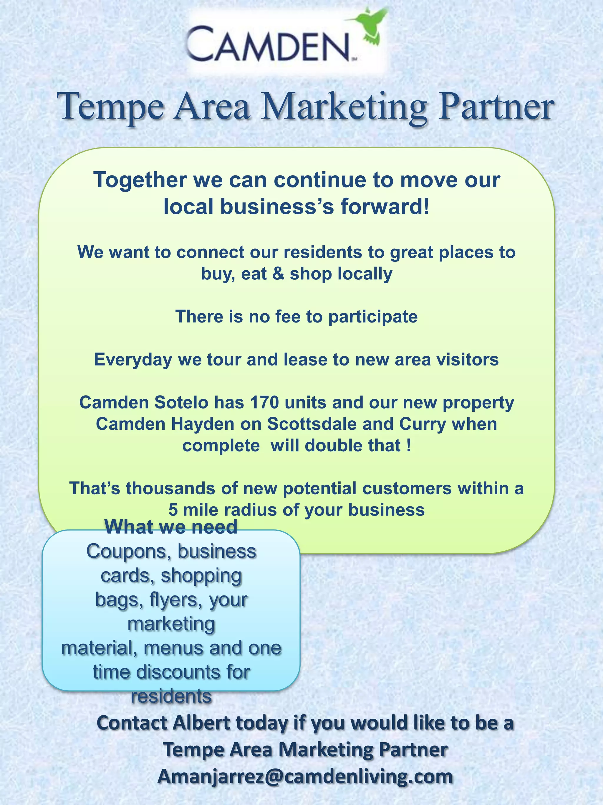 The document promotes a marketing partnership program where local businesses can provide promotional materials like coupons and flyers to a property management company that manages over 300 apartment units in Tempe, in order to reach thousands of potential new customers in the area. There is no fee for businesses to participate in the program, and they simply need to provide promotional items to the property management company, which will distribute them to new residents, in order to connect locals to nearby shops, restaurants, and other businesses.