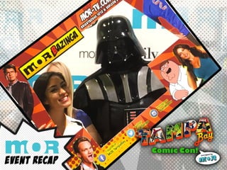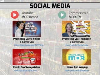 This document contains a list of comic con spot runs from May through July with associated 5 second IDs, TV networks, and links to Google sheets. Spots aired in May on MOR 158 and This TV 52, in June on MOR 65, Estrella 64 and This TV 67, and in July on MOR 368 and This TV 149. The links provided access to spreadsheets with additional details on the spot runs.