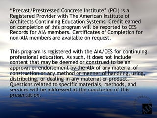 The Precast/Prestressed Concrete Institute (PCI) is a registered provider for AIA's continuing education, offering programs that emphasize the benefits of precast components, such as cost-efficiency, aesthetic versatility, and safety. The document discusses the advantages of precast concrete in structured parking, highlighting features like fast construction, durability, and economic value through integrated design methods. It concludes with insights on maintenance, design considerations, and the importance of quality control in precast concrete production.