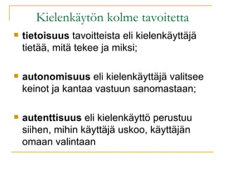 Kielenkäytön kolme tavoitettatietoisuus tavoitteista eli kielenkäyttäjä tietää, mitä tekee ja miksi; autonomisuus eli kielenkäyttäjä valitsee keinot ja kantaa vastuun sanomastaan; autenttisuus eli kielenkäyttö perustuu siihen, mihin käyttäjä uskoo, käyttäjän omaan valintaan