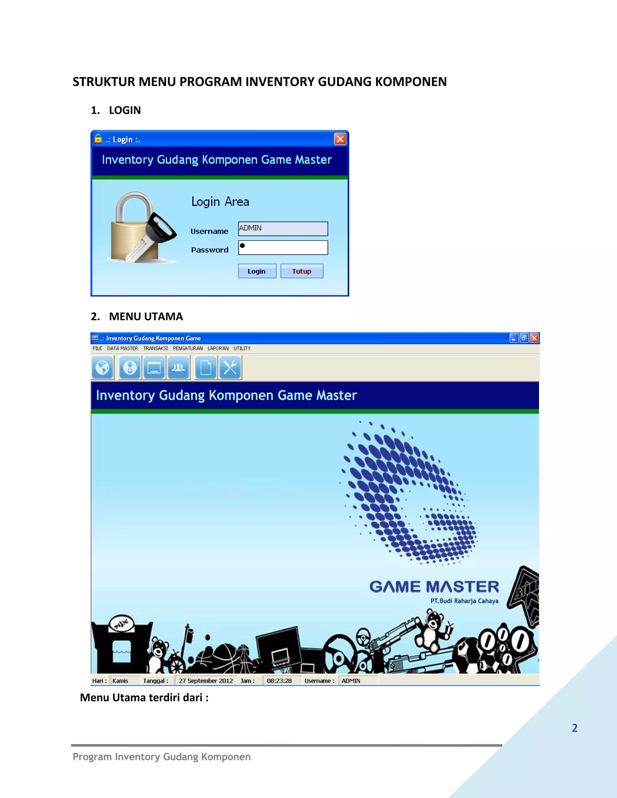Program ini menyediakan menu utama untuk melakukan transaksi inventory gudang komponen, meliputi data master seperti barang, supplier, lokasi, pembelian, pengeluaran, dan laporan. Beberapa fitur masih perlu perbaikan seperti edit data, pencarian, dan konsep pengeluaran dalam proses.