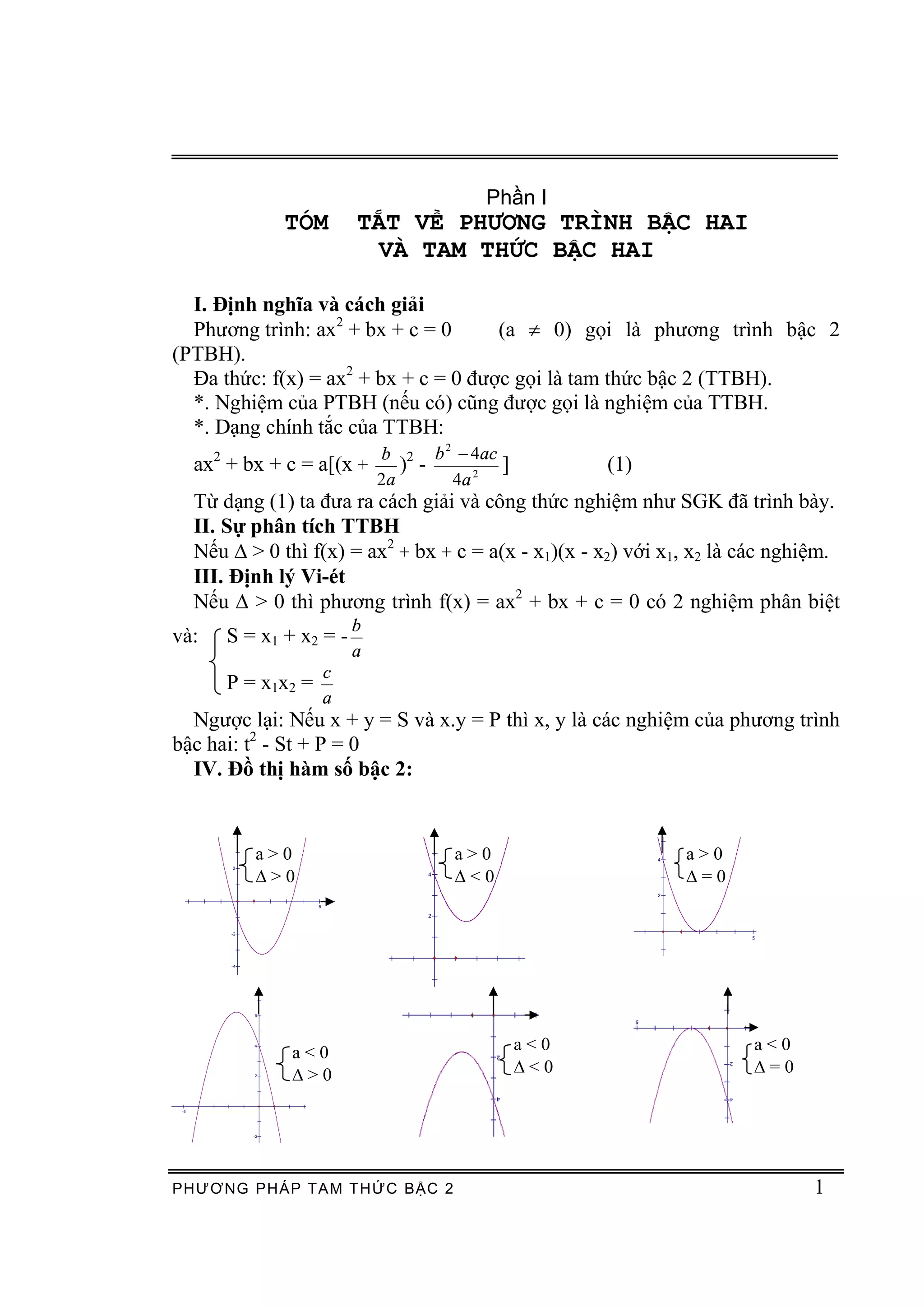Tài liệu cung cấp cái nhìn tổng quát về phương trình bậc hai và tam thức bậc hai, bao gồm định nghĩa, cách giải, và các định lý liên quan như định lý Viète. Nó cũng trình bày các trường hợp nghiệm của phương trình và phương pháp giải bài toán ứng dụng liên quan đến tam thức bậc hai. Ngoài ra, tài liệu còn đề cập đến mối quan hệ giữa các nghiệm của hai phương trình bậc hai và các bài tập minh họa.