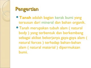 Tanah terbentuk dari pecahan batuan akibat faktor lingkungan seperti pelapukan dan penghancuran. Tanah terdiri atas lapisan-lapisan yang terbentuk dari bahan induk berdasarkan proses pembentukannya. Tanah memainkan peran penting bagi tumbuhan sebagai tempat tumbuh, pertukaran hara, dan penyedia air.
