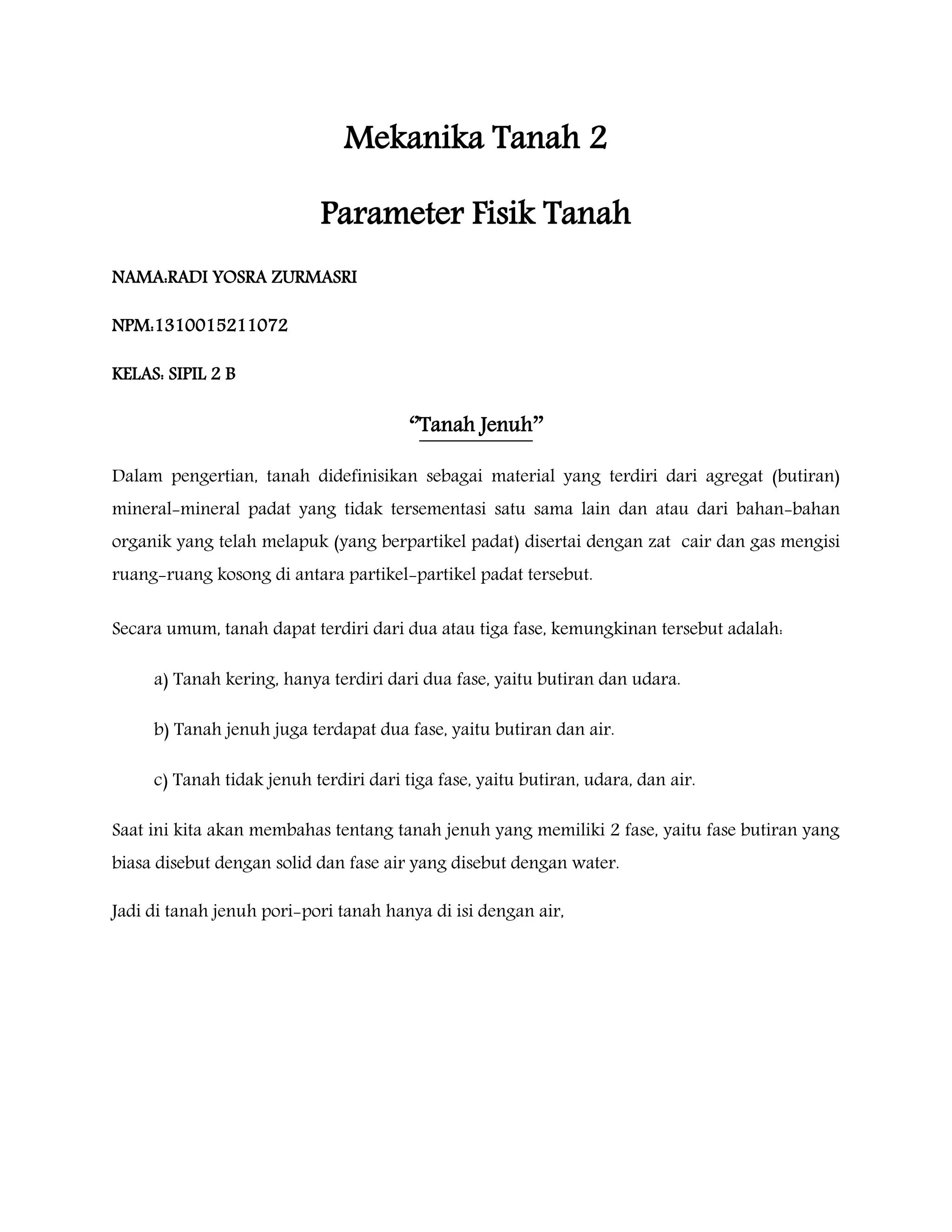 Dokumen ini membahas tentang mekanika tanah jenuh, yang terdiri dari dua fase, yaitu butiran padat dan air. Penjelasan mencakup berbagai hubungan volume dalam tanah, seperti volume pori, angka pori, porositas, derajat kejenuhan, dan kadar air. Selain itu, dibahas juga berat volume lembab atau basah dari tanah.