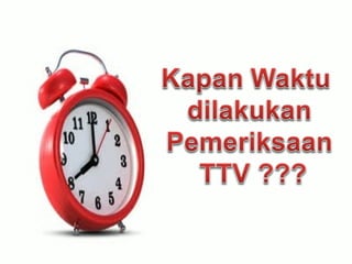 Dokumen ini membahas pentingnya pengukuran tanda-tanda vital (TTV) seperti suhu tubuh, nadi, pernapasan, dan tekanan darah dalam mengetahui kondisi kesehatan klien dan membantu diagnosis serta intervensi keperawatan. TTV dipengaruhi oleh berbagai faktor seperti umur, aktivitas, dan kondisi kesehatan, serta harus diukur pada waktu yang tepat, termasuk sebelum dan sesudah prosedur medis. Selain itu, penjelasan tentang mekanisme pengaturan temperatur tubuh dan cara pengukuran suhu juga disertakan.
