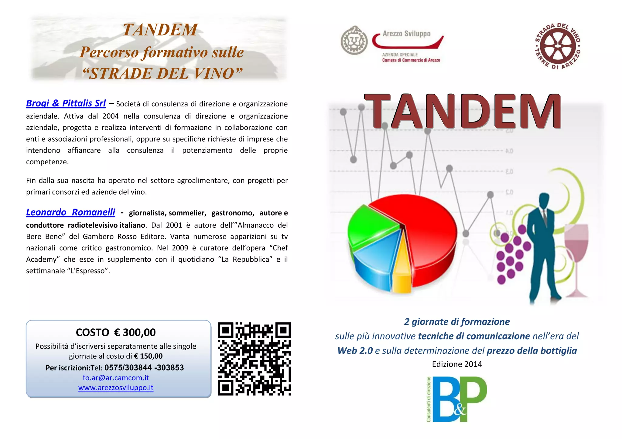 Il documento descrive un percorso formativo sulle strategie di marketing e prezzo nel settore vinicolo, organizzato da Brogi & Pittalis Srl, attivo dal 2004 nella consulenza aziendale. Le giornate di formazione, condotte da esperti come Leonardo Romanelli, trattano temi come la comunicazione nell'era web 2.0 e la determinazione dei prezzi per le bottiglie di vino. Il costo del corso è di 300 euro, con la possibilità di partecipazione a singole giornate.