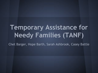 The Temporary Assistance for Needy Families (TANF) program provides cash assistance to needy American families and was established in 1997 by the Personal Responsibility and Work Opportunity Act under President Bill Clinton on July 1st. It costs approximately $17.28 billion annually, administered by states but funded 80% by the federal government. States must meet work requirements to receive block grants and can only provide cash assistance for up to 6 months to encourage employment and reduce long-term dependency. The program has faced political controversy but not major modifications since inception.