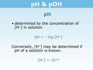- pH is determined by the negative log of the hydrogen ion (H+) concentration in a solution, while pOH is determined by the negative log of the hydroxide ion (OH-) concentration. - The pH of water is 7 because at 25°C, the H+ concentration is 1.0 x 10-7 and the log of that value is 7. However, pH varies with temperature as the self-ionization constant of water (Kw) changes with temperature. - pOH can be calculated from pH using the relationship that pH + pOH must equal 14 for any aqueous solution.