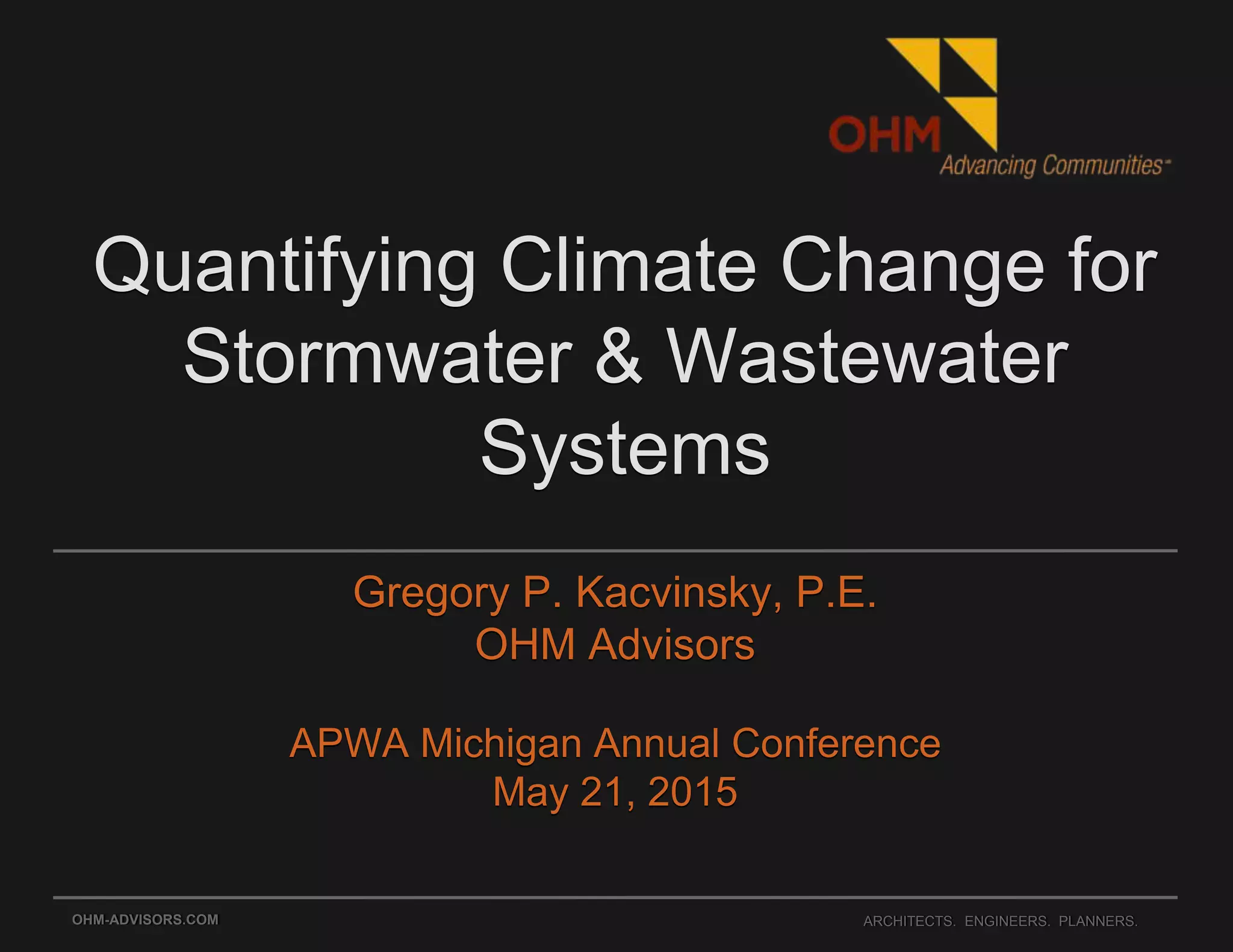 The document discusses the impact of climate change on stormwater and wastewater systems, emphasizing the need to adapt infrastructure due to increased precipitation predicted by climate models. It highlights that existing systems are aging and might not withstand future rainfall patterns, suggesting a 10-20% increase in design flows to accommodate these changes. Various tools and updated rainfall statistics are recommended for utility sizing and planning for future climate conditions.